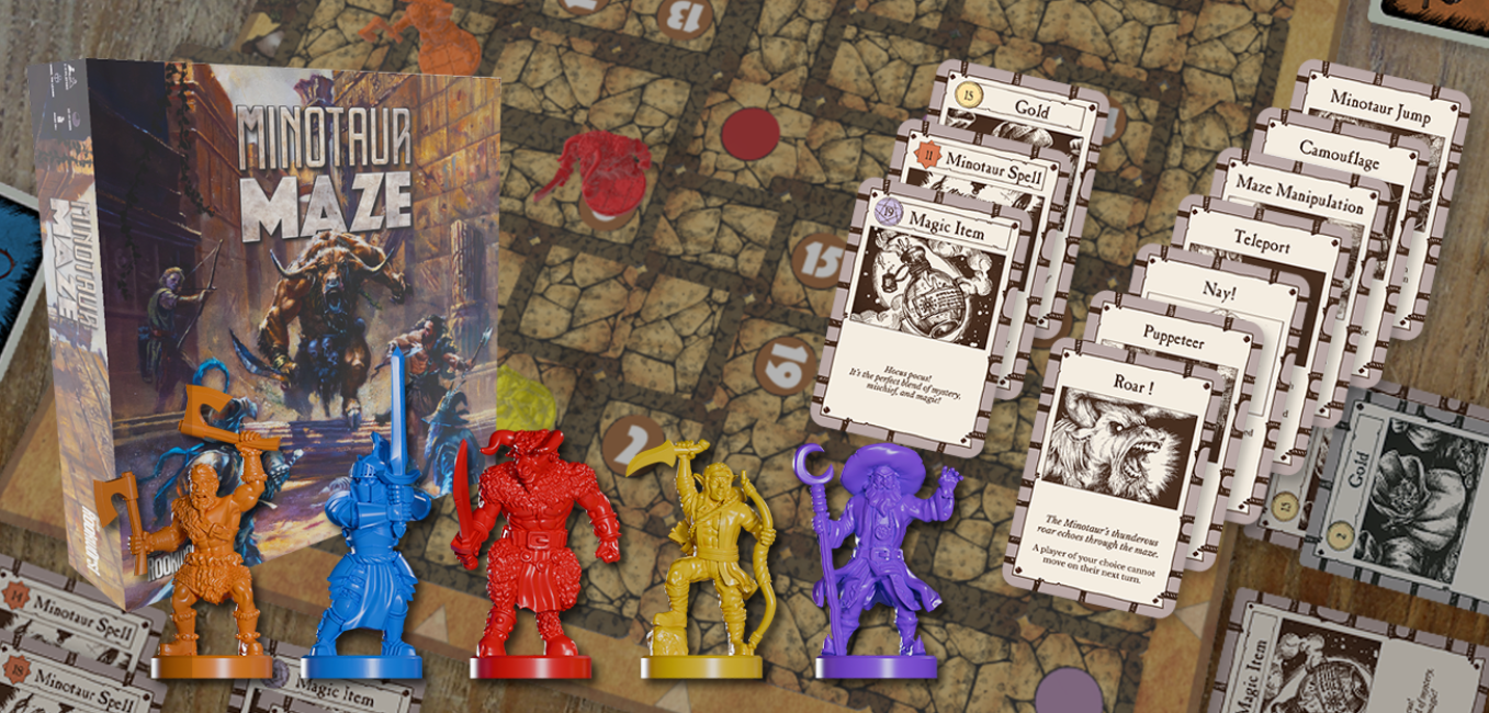 Minotaur Maze is a strategy board game for 2-4 players where you navigate a shifting labyrinth to collect treasures. But watch out for the Minotaur: all players can controle the Minotaur and steal your treasures for themselves!