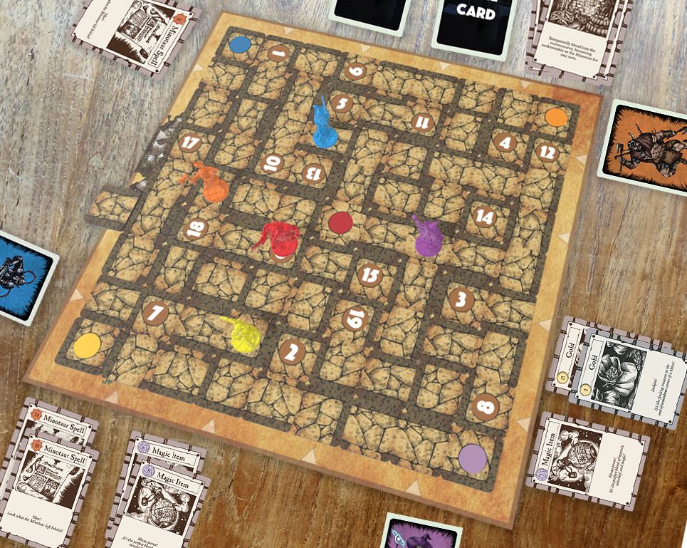 Minotaur Maze is a strategy board game for 2-4 players where you navigate a shifting labyrinth to collect treasures. But watch out for the Minotaur: all players can controle the Minotaur and steal your treasures for themselves.